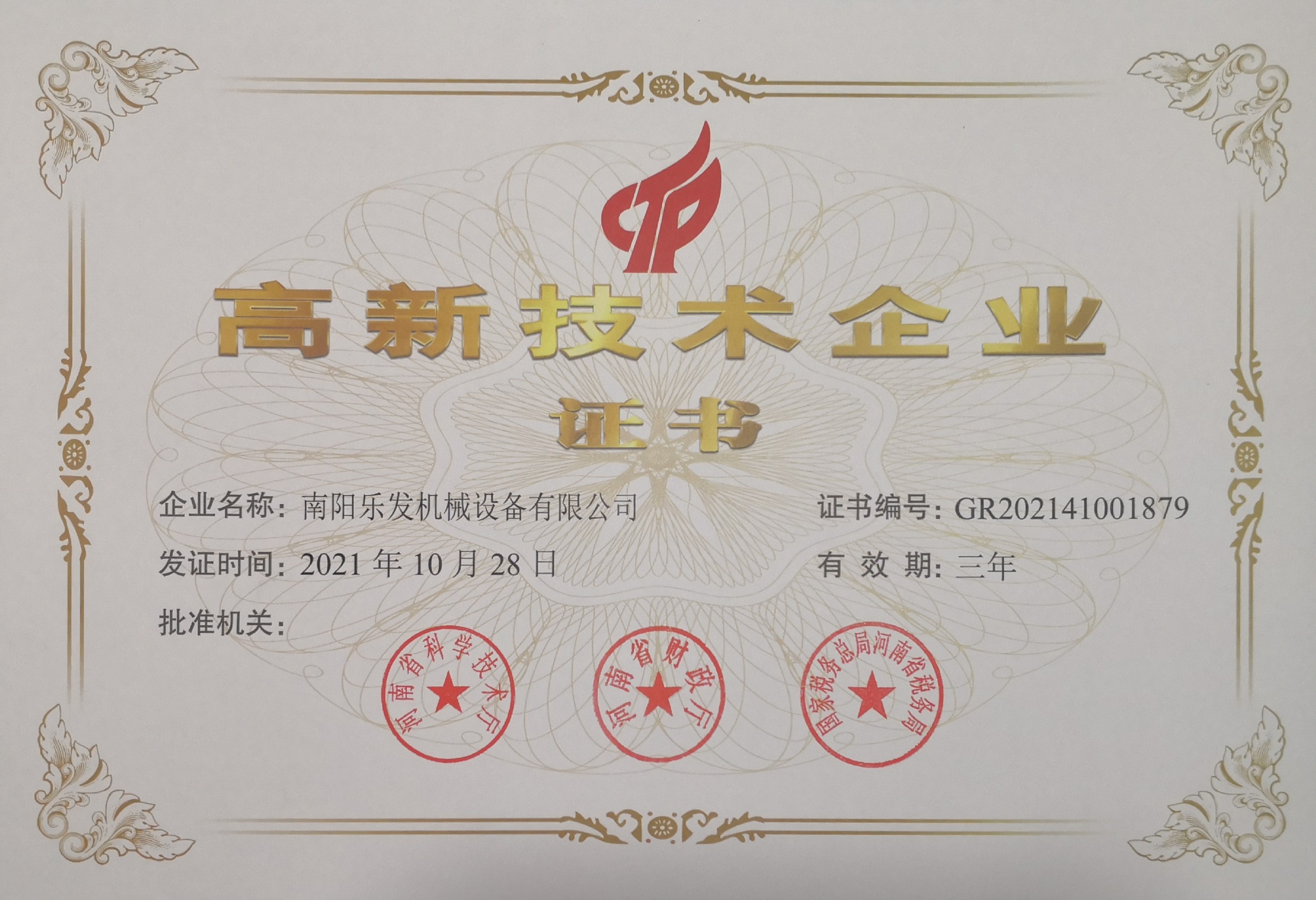 樂發(fā)機械高新技術(shù)企業(yè)證書