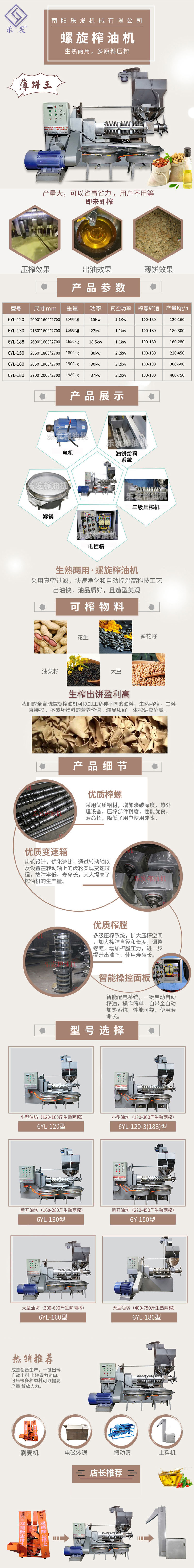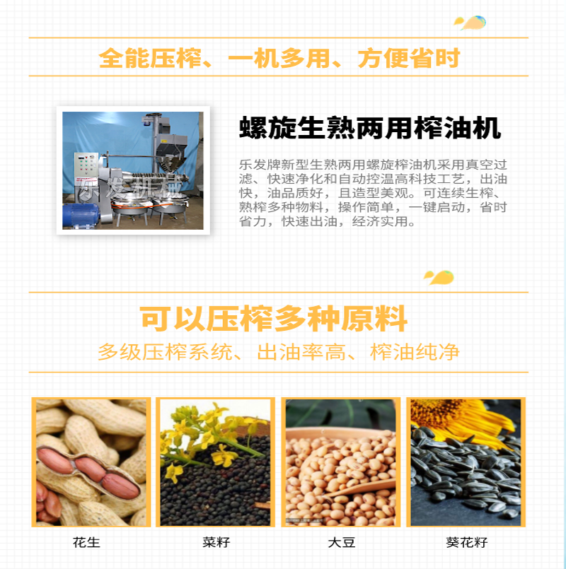 確定好物料后,然后選擇榨油機廠家,目前榨油機的生產技術已經非常成熟,大家只要認準正規(guī)的生產廠家,售后服務有保障的都是可以的,樂發(fā)牌榨油機專注榨油機行業(yè)20余年,憑借技術精良、完善的服務及優(yōu)良的口碑傳播占領國內市場,已出口產品國內外全球,主要生產螺旋榨油機,液壓榨油機,各種相關榨油機配件產品。經過20多年的辛勤探索,南陽樂發(fā)建立了一套完備有效的服務體系,打造了一支經驗豐富的服務團隊,為客戶提供技術培訓,而且派技術人員現(xiàn)場指導安裝和調試設備。我司二十余載的拼搏與奮斗,成就了井然有序、開拓進取的"樂發(fā)"牌,也走出了一條高新產品、經濟效益與環(huán)境保護可持續(xù)發(fā)展的樂發(fā)"特色之路,樂發(fā)糧油機械愿以更新的技術,更高的質量,更好地服務廣大新老用戶,真誠合作,再創(chuàng)輝煌!