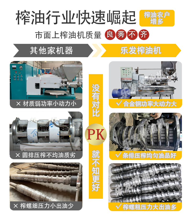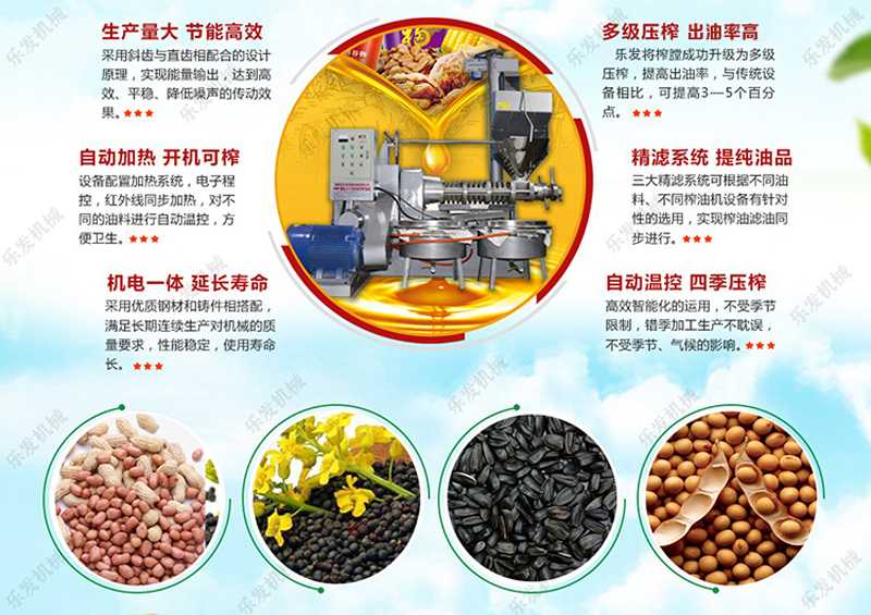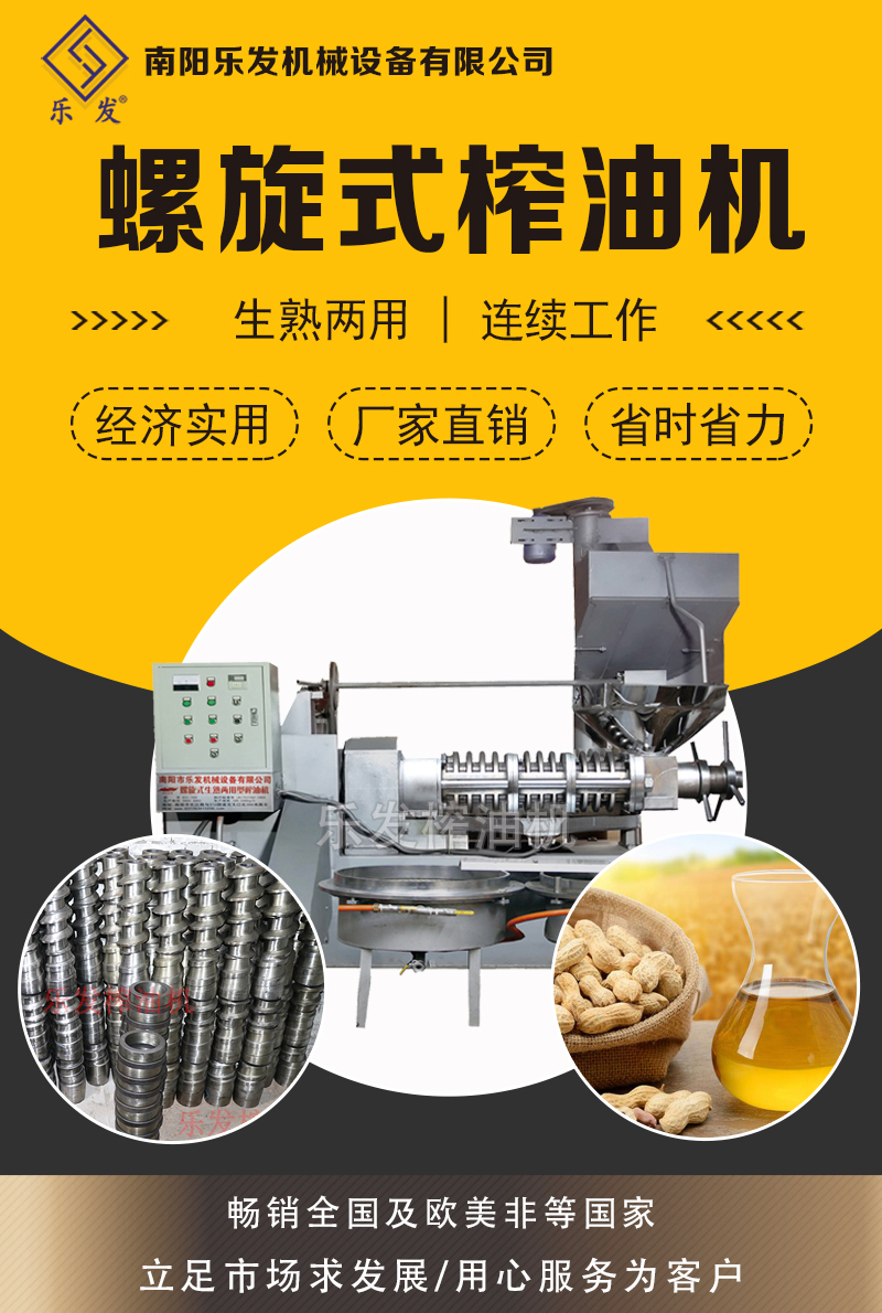 花生榨油機,南陽樂發(fā)機械生產(chǎn)螺旋榨油機22年,針對油廠實際情況,南陽樂發(fā)機械推薦合適的熱榨或者冷榨工藝,樂發(fā)牌花生榨油機,制取食用油健康符合人們生活需求。