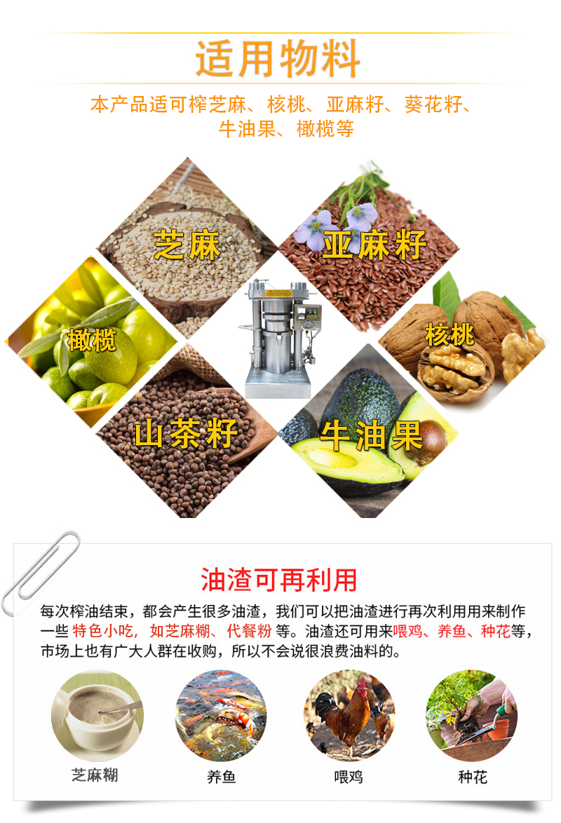 1、可實現(xiàn)芝麻、花生、油葵、杏仁、核桃、松籽、紫蘇等高含量油作物的壓榨,對一些保健油類可實現(xiàn)純冷榨工藝。配用鉆孔料桶可實現(xiàn)對油渣的處理。
