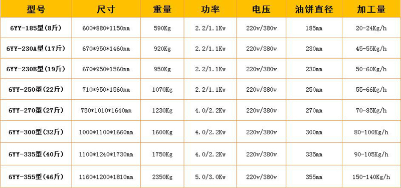 型號 | 尺寸 | 重量 | 功率 | 電壓 | 油餅直徑 | 加工量 |