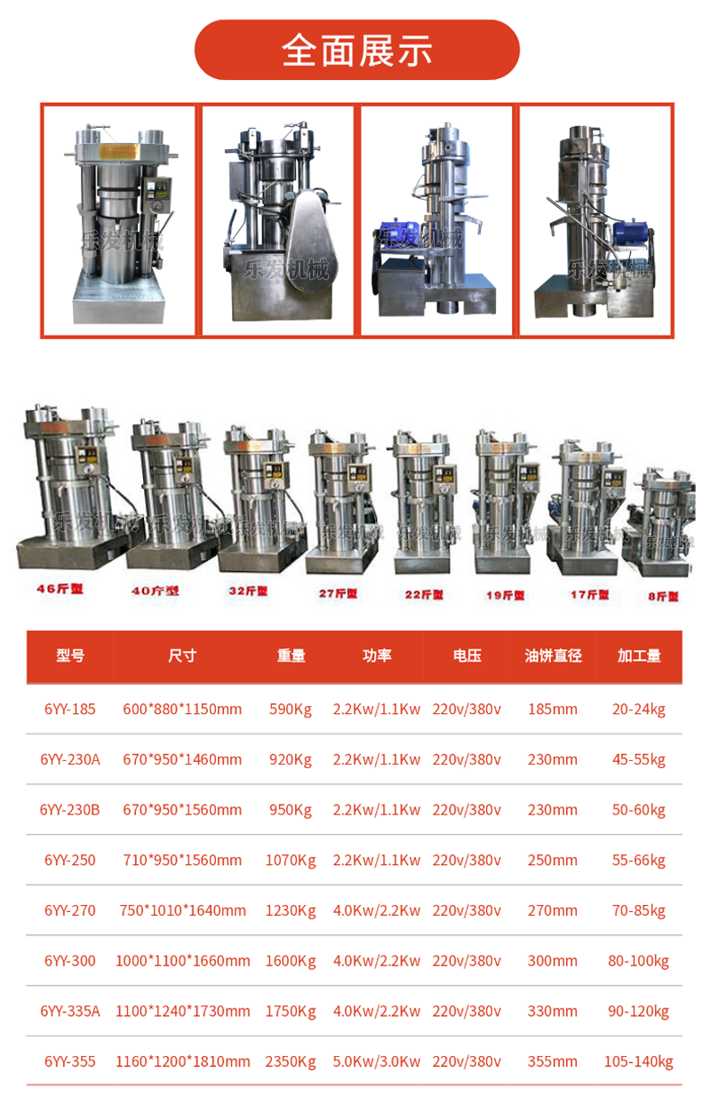 型號 | 尺寸 | 重量 | 功率 | 電壓 | 油餅直徑 | 加工量 |